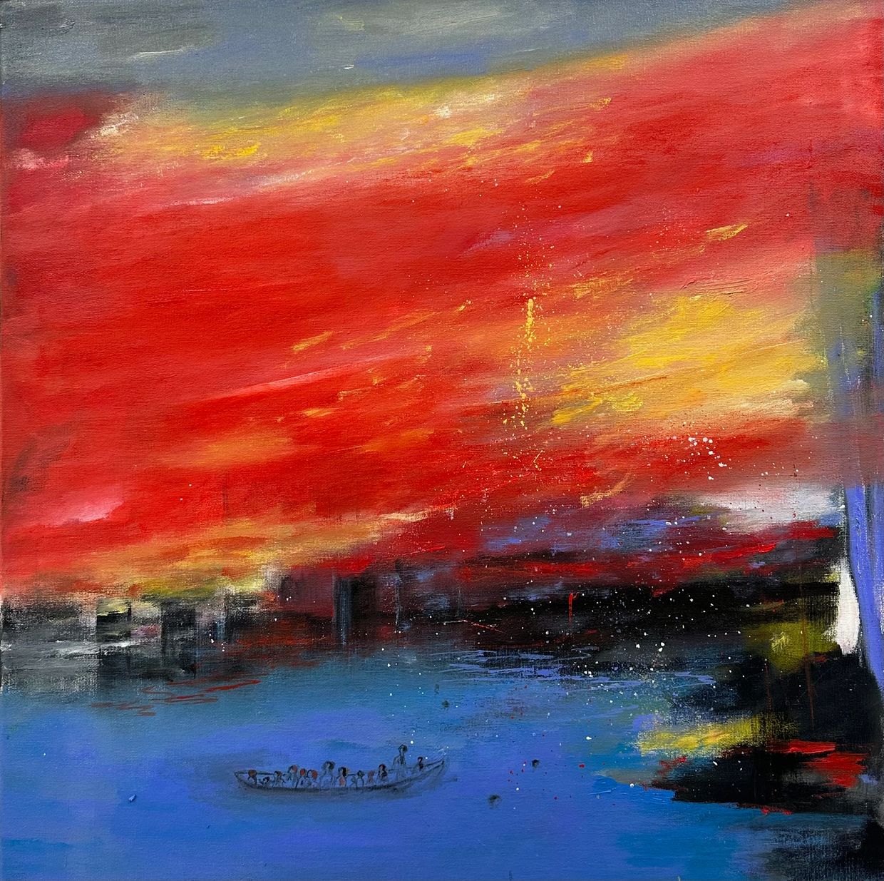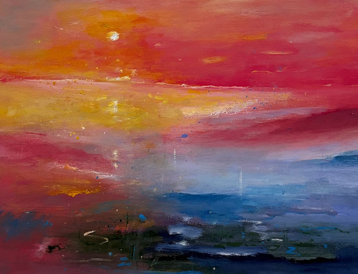 Sunrise (2026), Oil, charcoal, and crayon on canvas, 38 x 43 cm